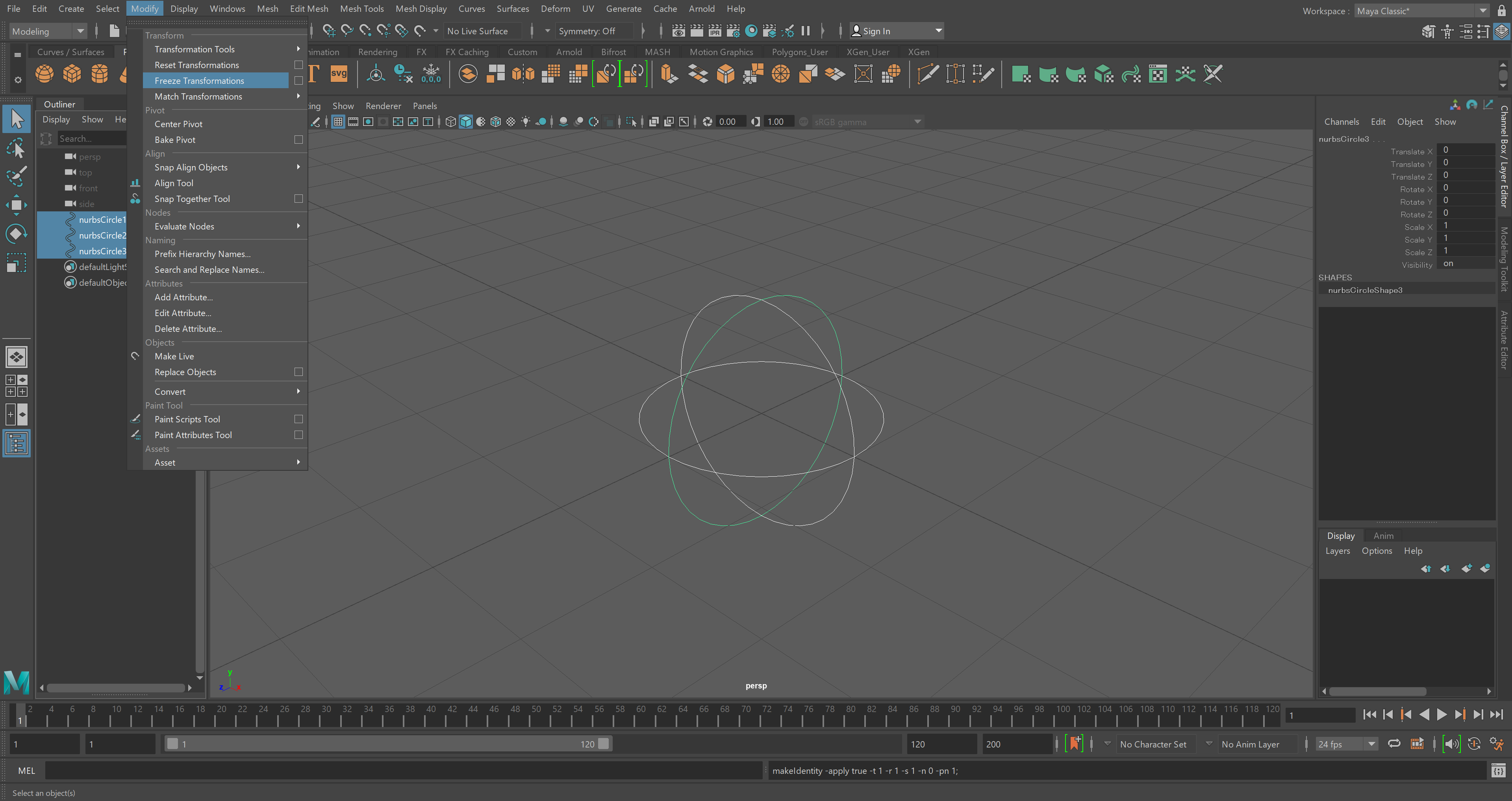 NURBS Curveをすべて選択し、メニューバーからModify > Freez Transformationsを実行します。
