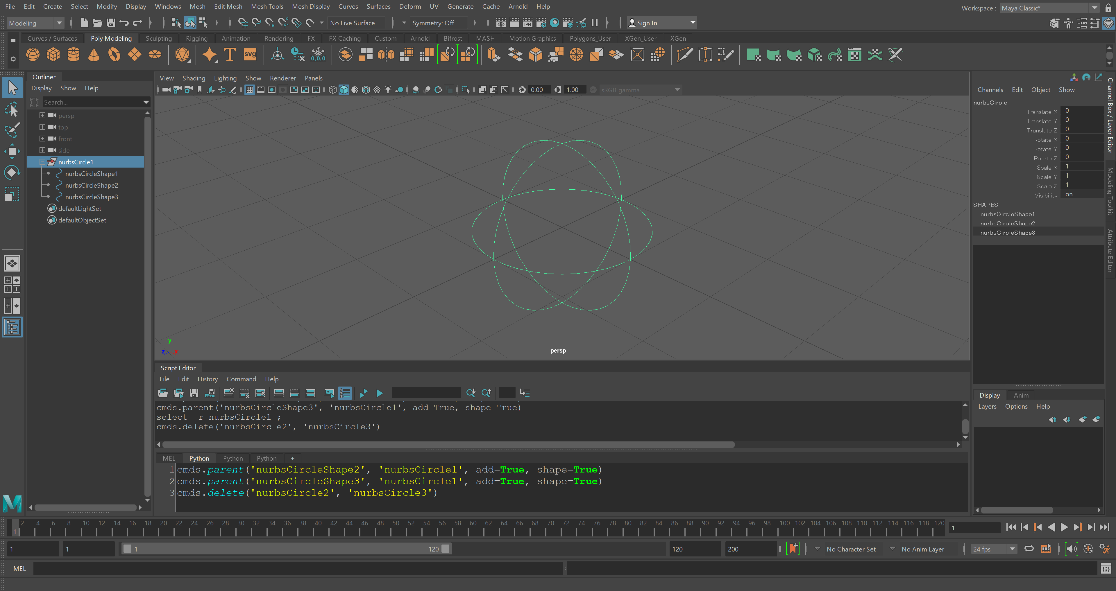 cmds.parent('nurbsCircleShape2', 'nurbsCircle1', add=True, shape=True) cmds.parent('nurbsCircleShape3', 'nurbsCircle1', add=True, shape=True) cmds.delete('nurbsCircle2', 'nurbsCircle3')