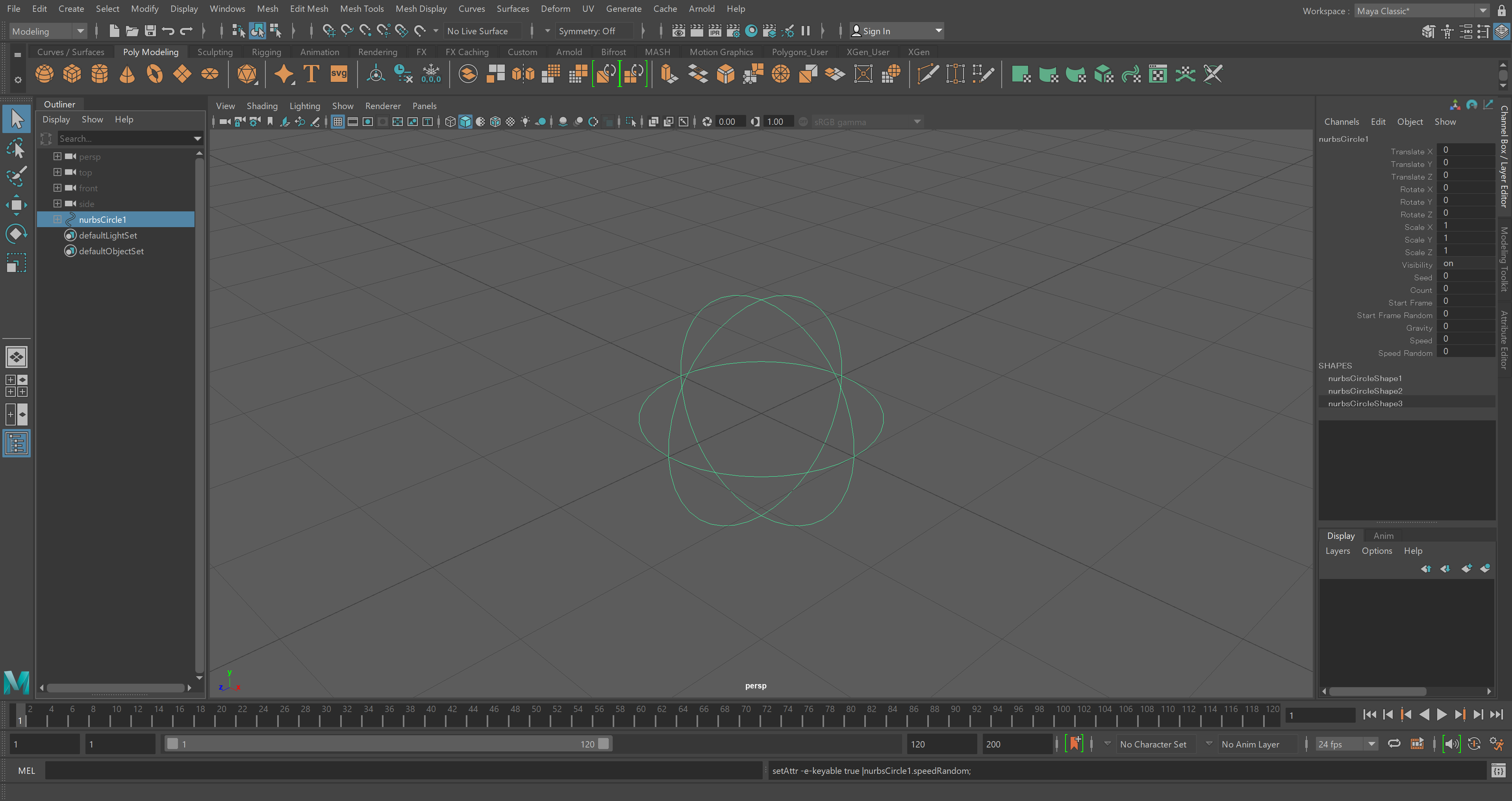 作成したnurbsCircle1をctrl+Dで2つ複製し、アトリビュートを以下のように設定し画像のような感じにします。