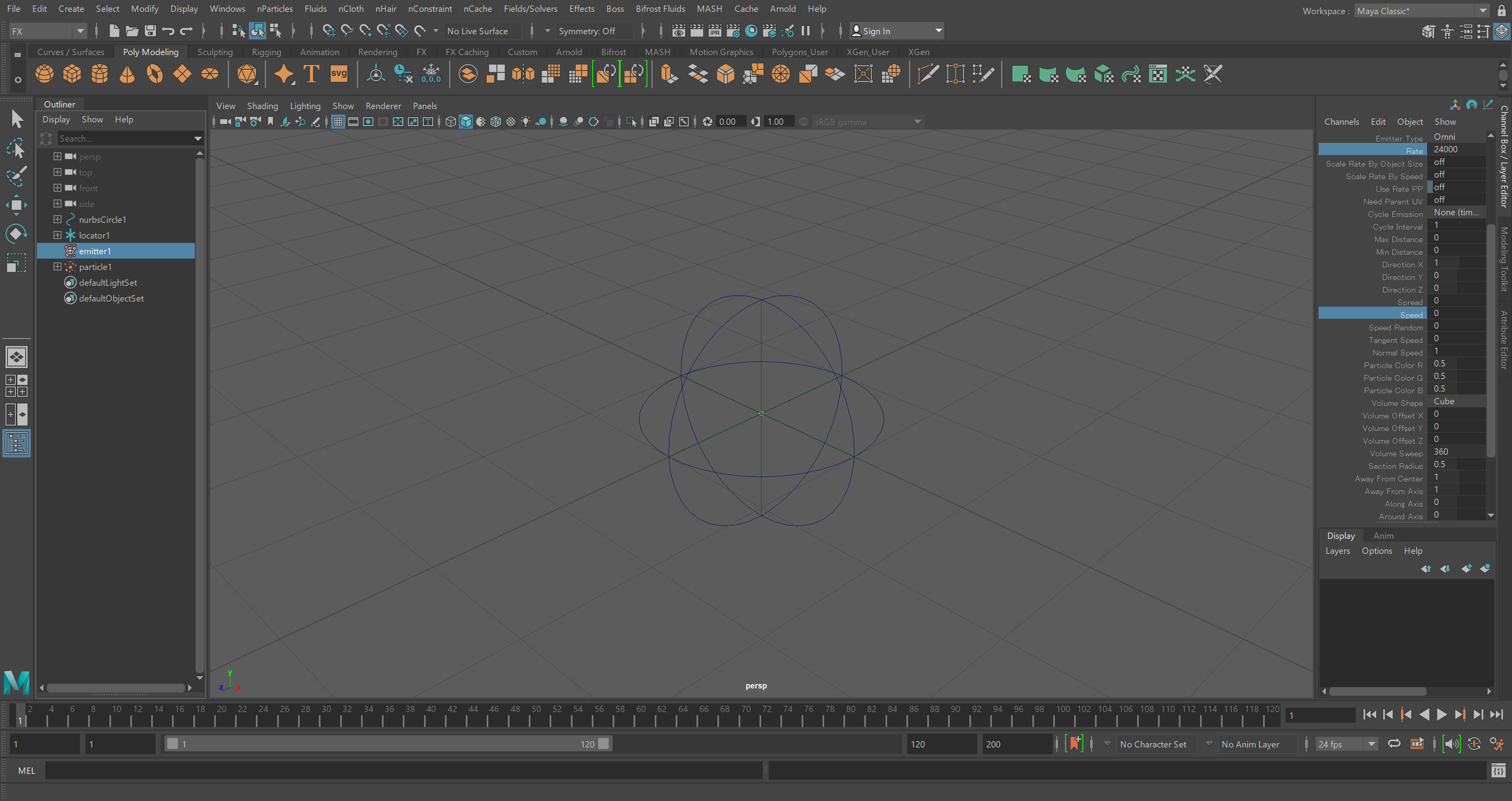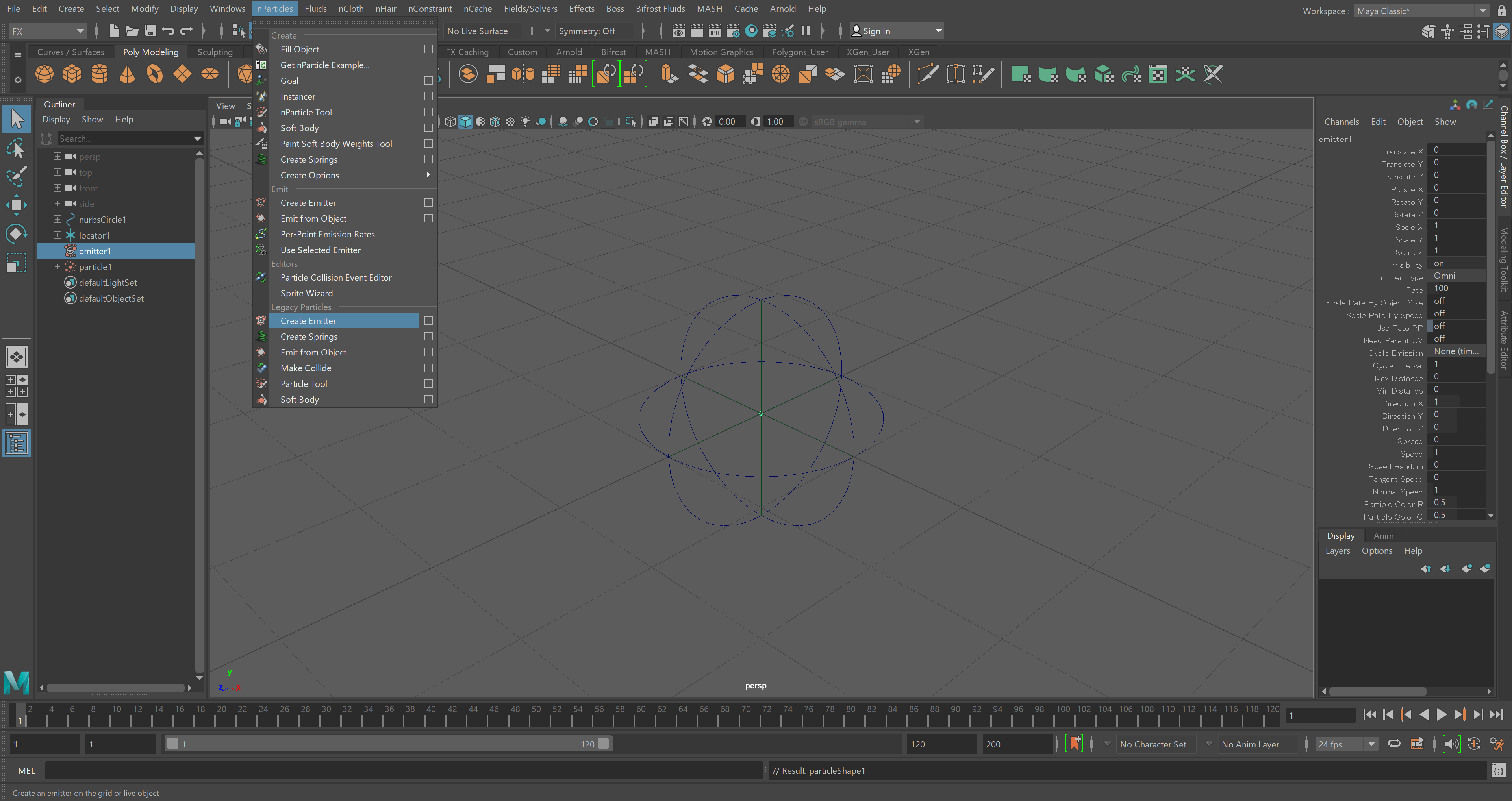 メニューバーのセットをFXにしてメニューバーからnParticles > Create Emitter (Legacy Particles)を実行します。