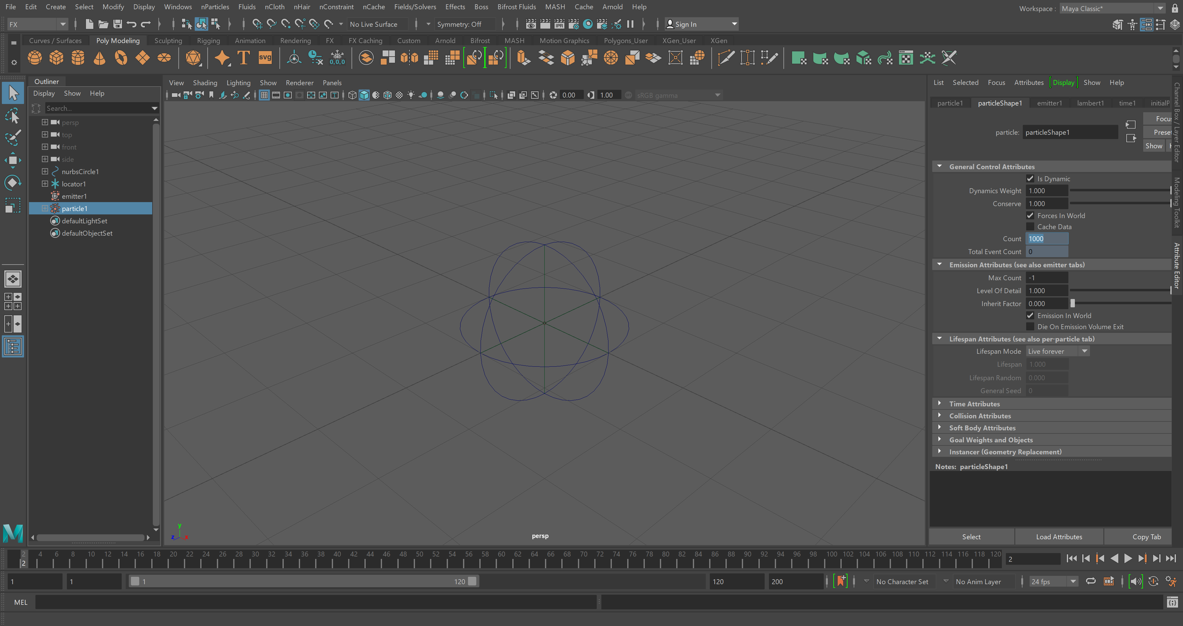 アニメーションフレームを開始フレームに戻してもparticleShape1のCountの値が1000であることを確認したら、emitter1は今後不要になりますので削除してしまいます。