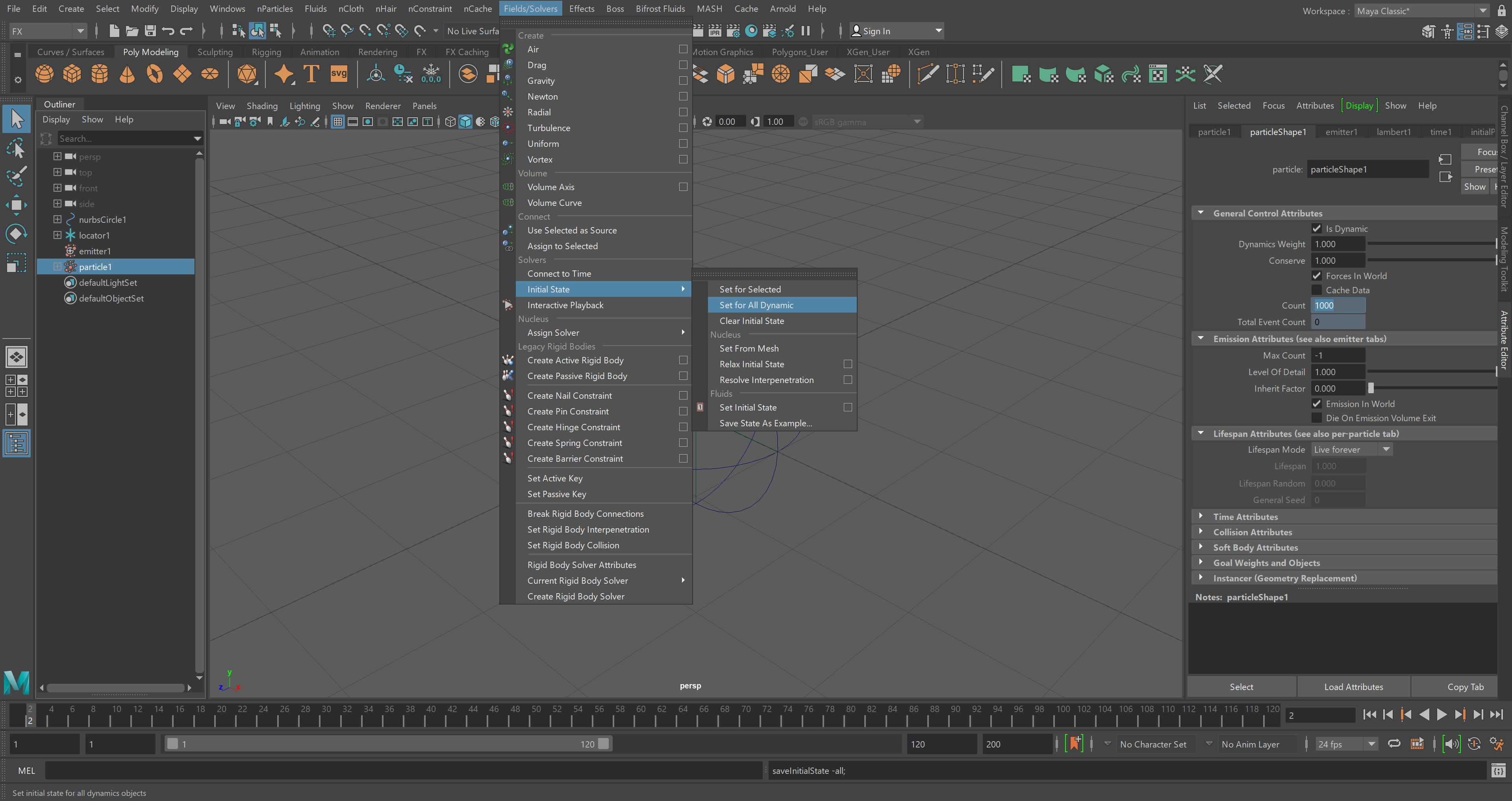 1フレームだけ進めた状態で、メニューバーからFields/Solvers > Inital State > Set for All Dynamicを実行します。